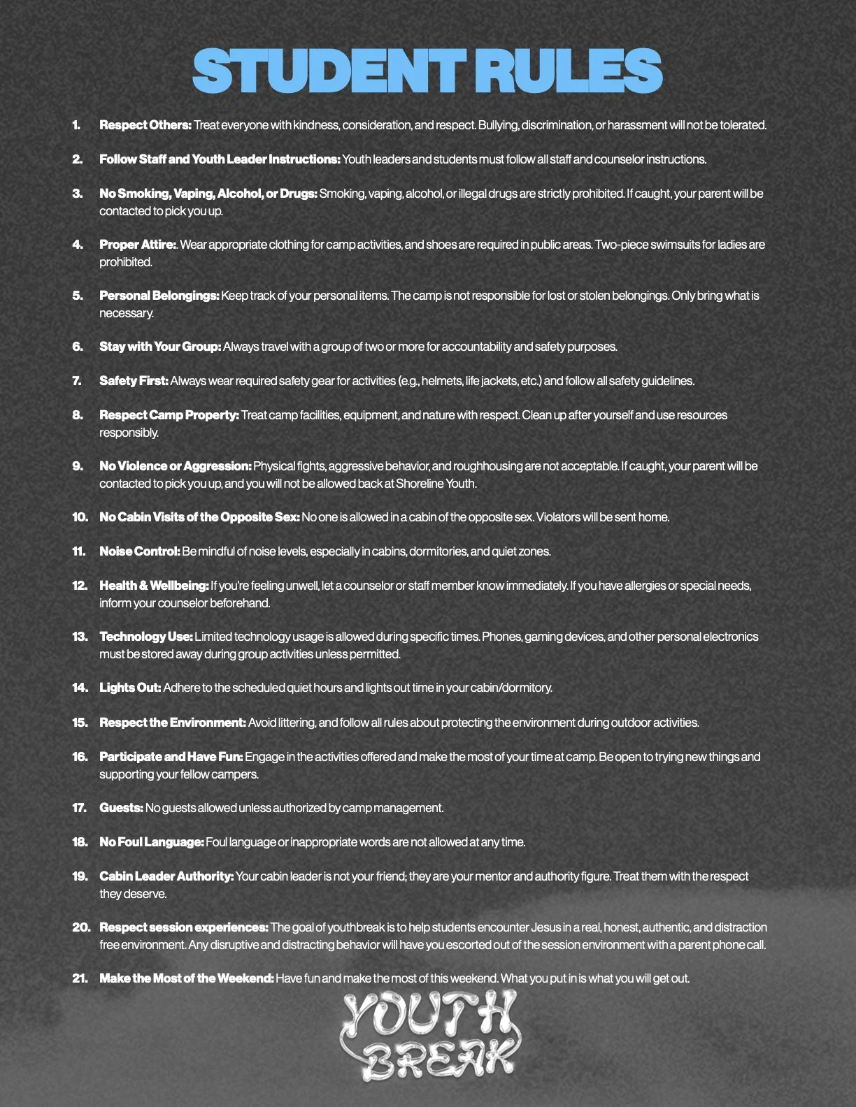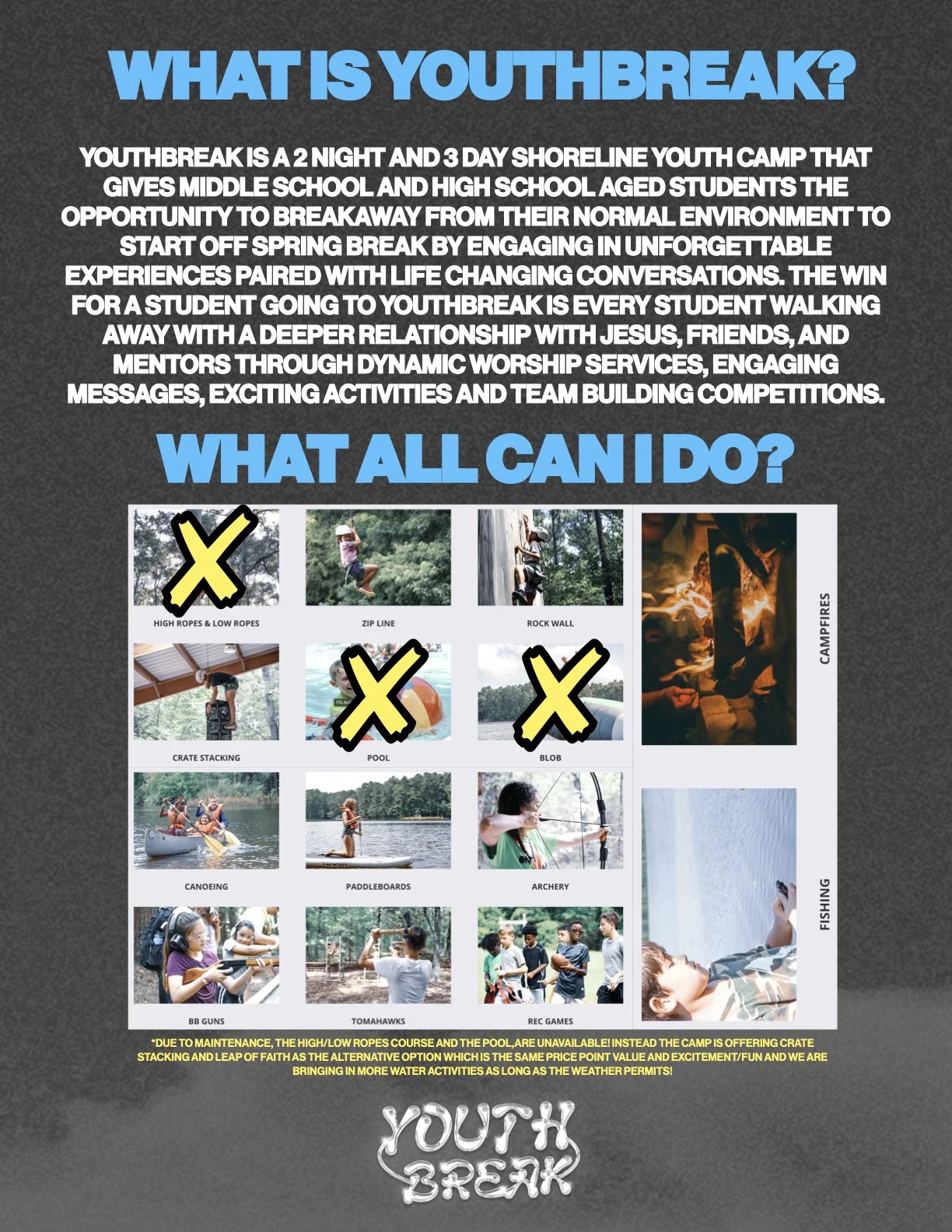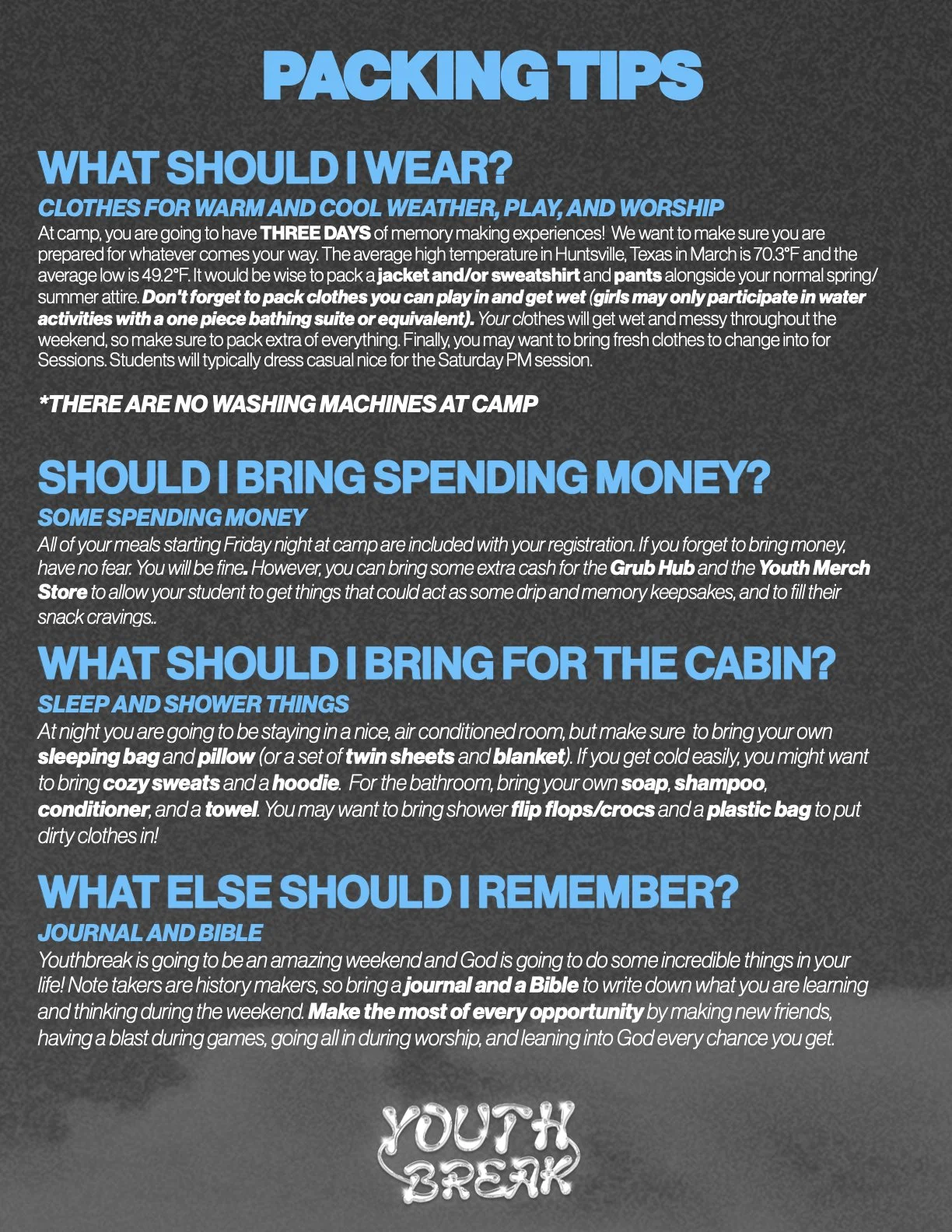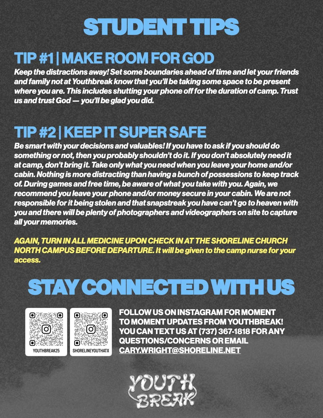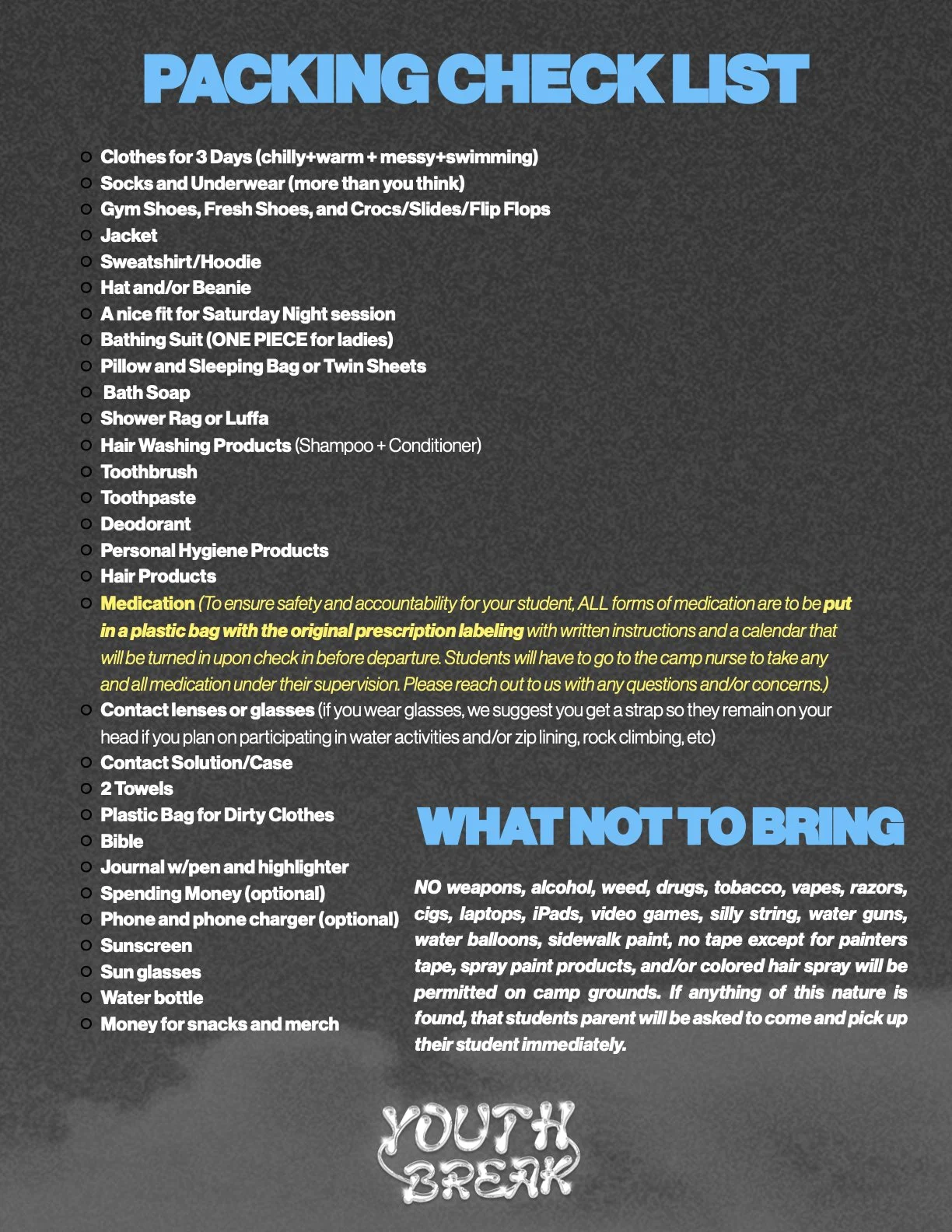 EVERYTHING YOU NEED TO KNOW TO GET READY FOR YOUTHBREAK 25 IS RIGHT HER EON THIS PAGE! YOU CAN TAP THE PICTURE BELOW TO MAKE THEM BIGGER OR USE YOUR FINGERS TO PINCH AND ZOOM IN!