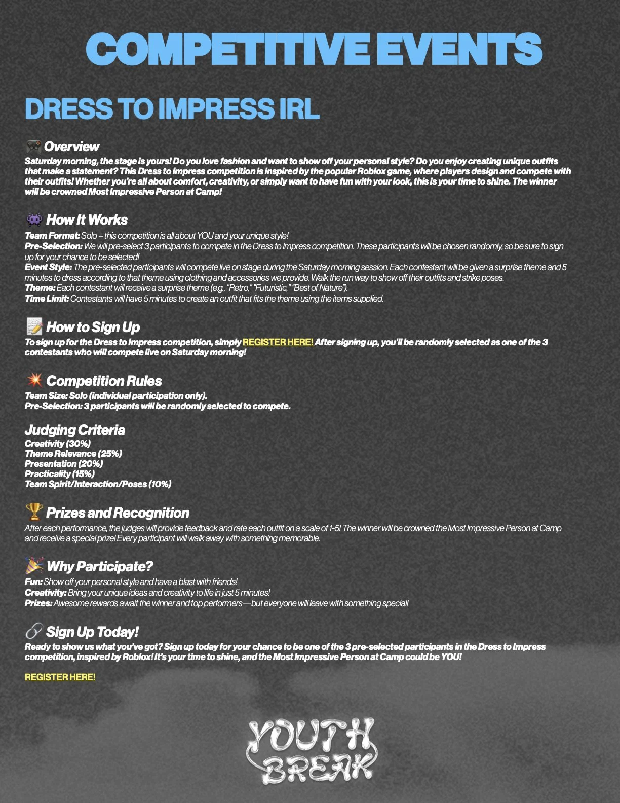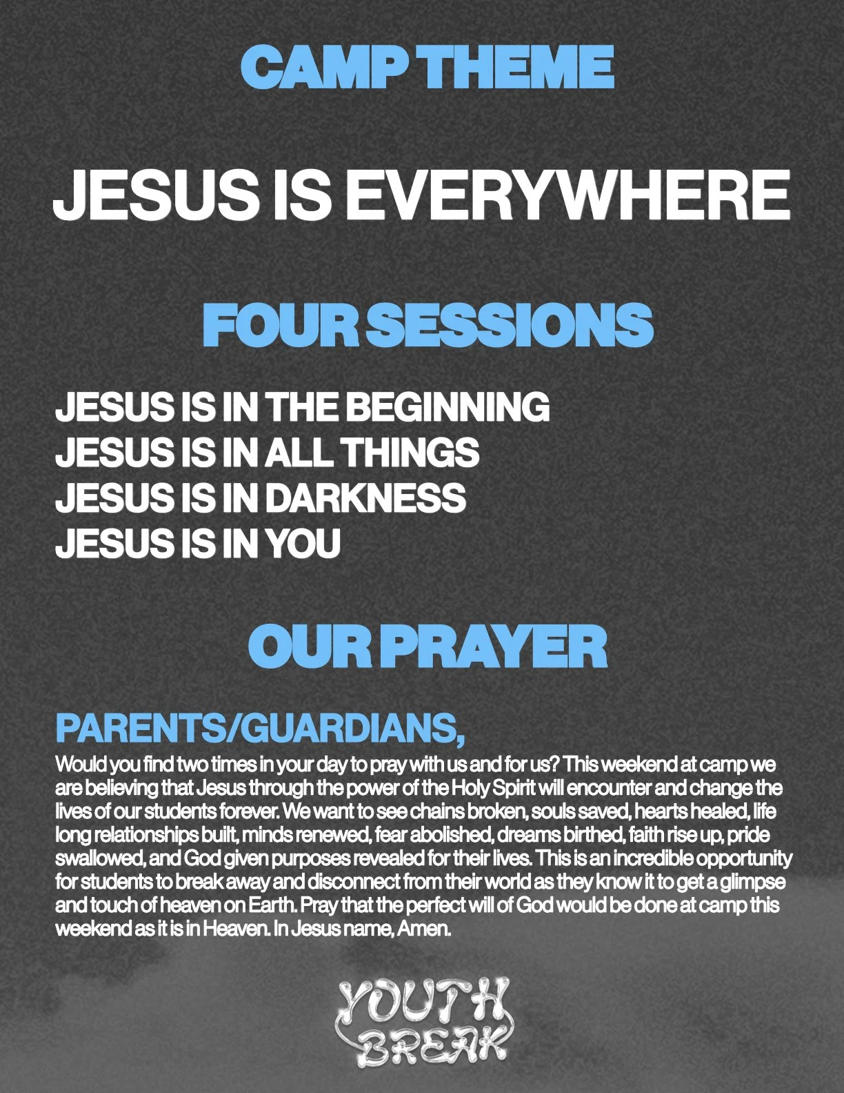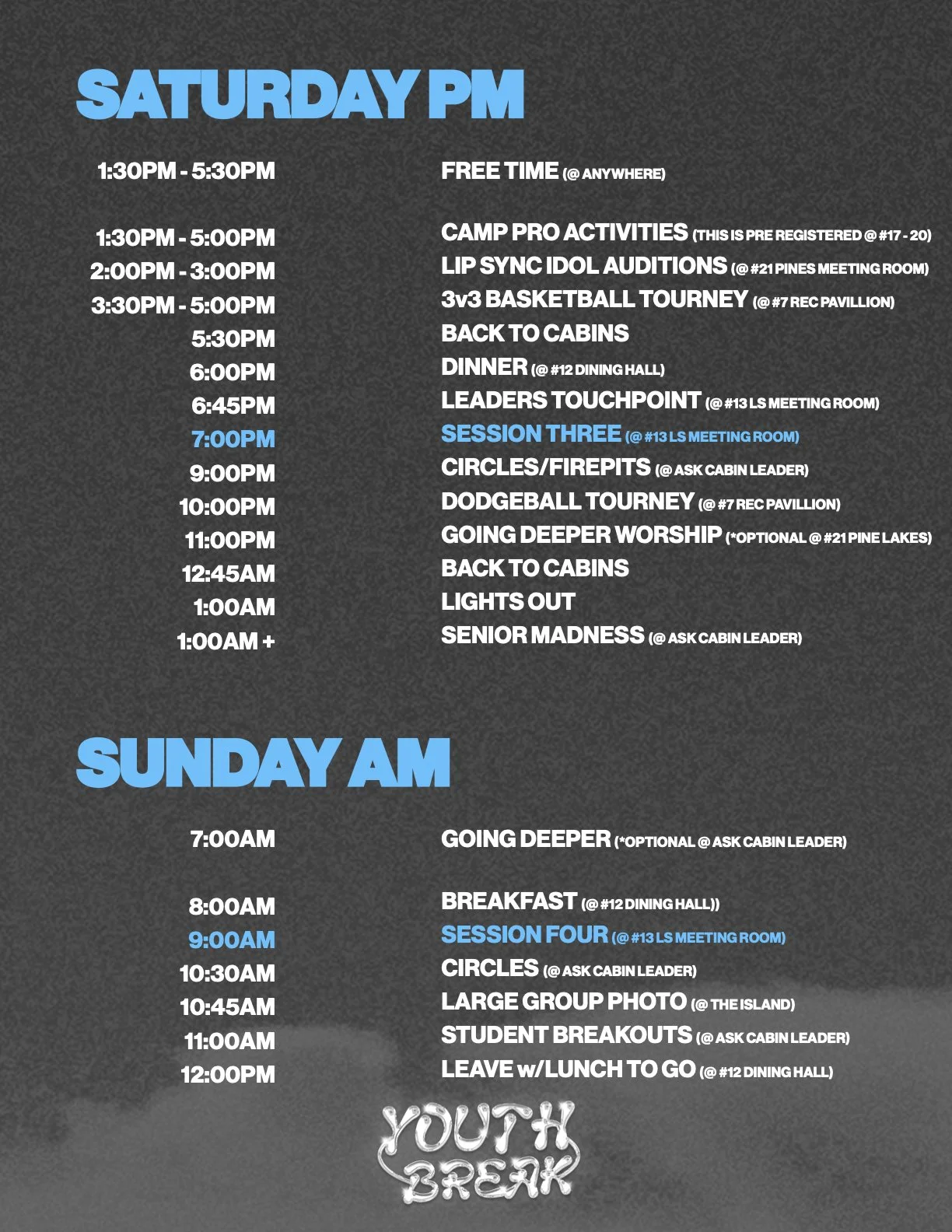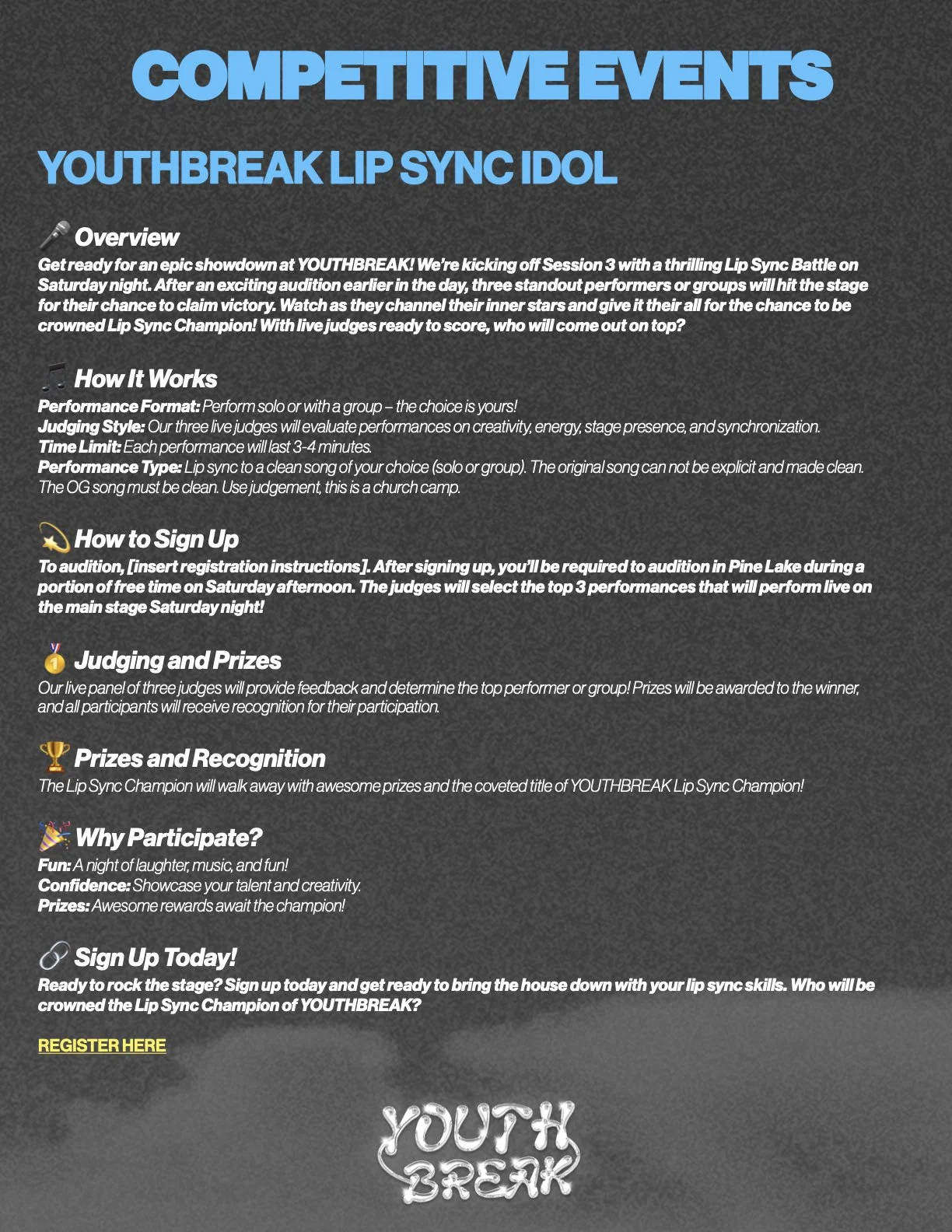 EVERYTHING YOU NEED TO KNOW TO GET READY FOR YOUTHBREAK 25 IS RIGHT HER EON THIS PAGE! YOU CAN TAP THE PICTURE BELOW TO MAKE THEM BIGGER OR USE YOUR FINGERS TO PINCH AND ZOOM IN!