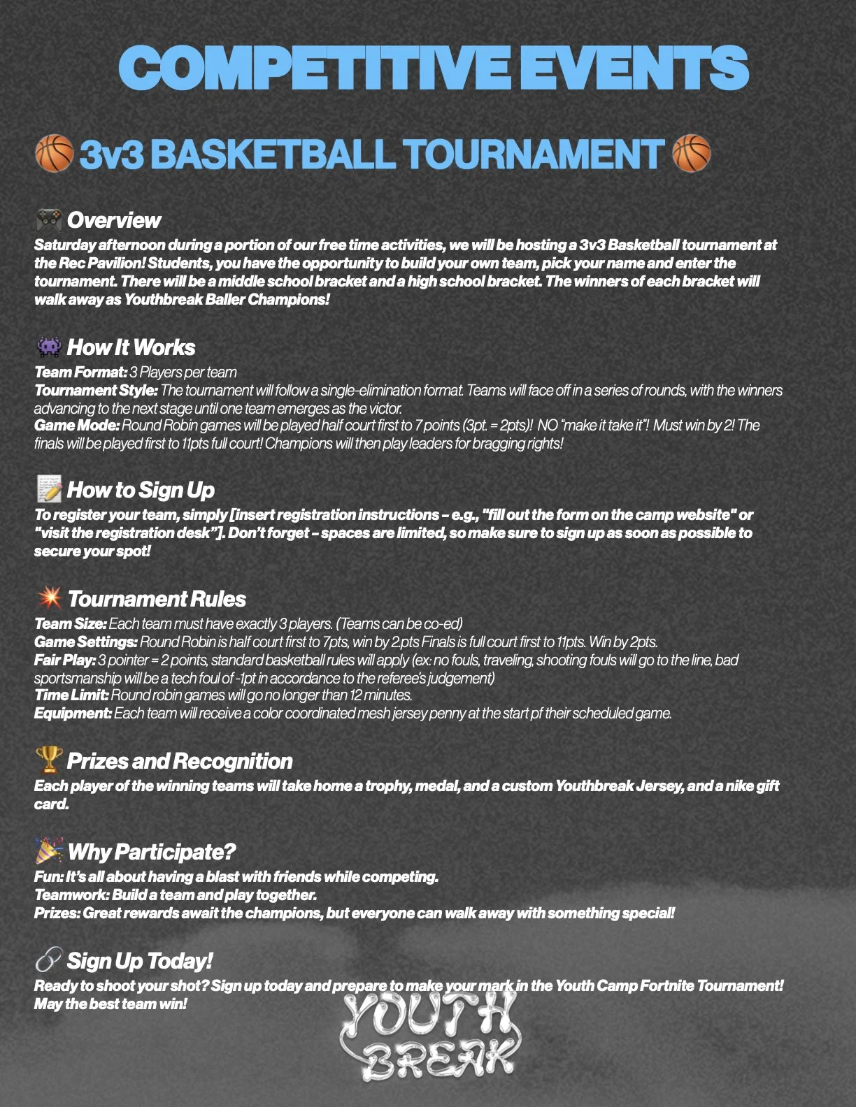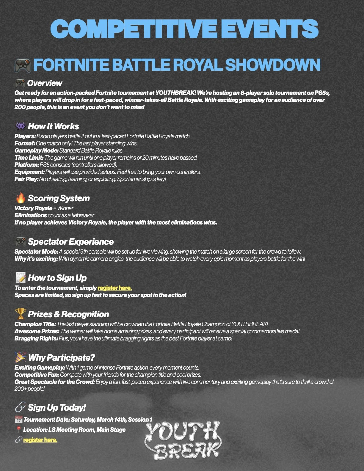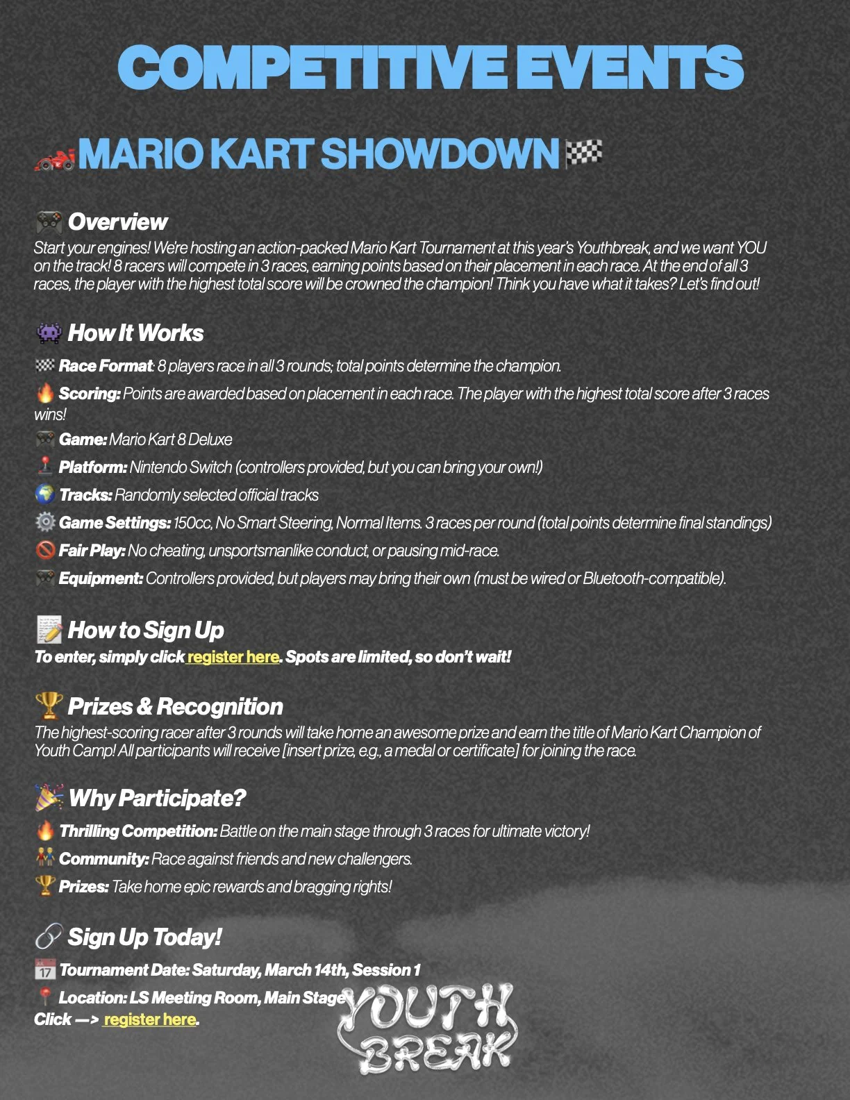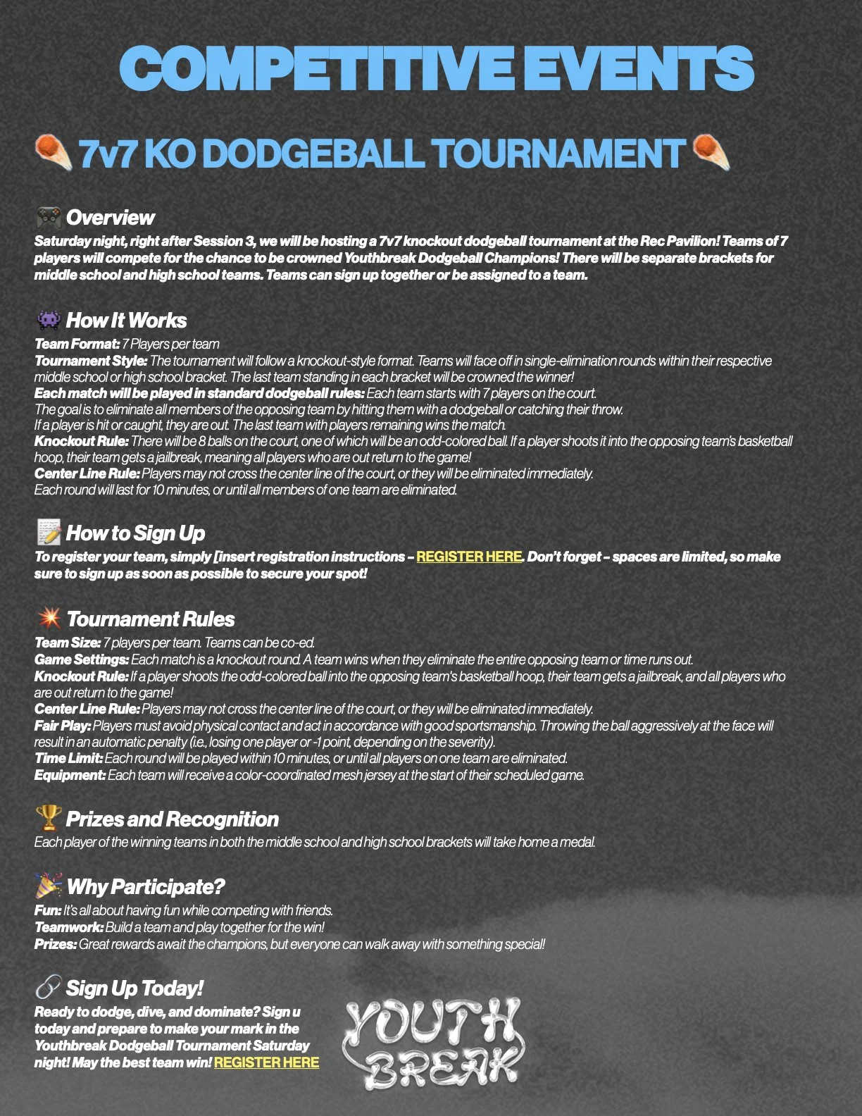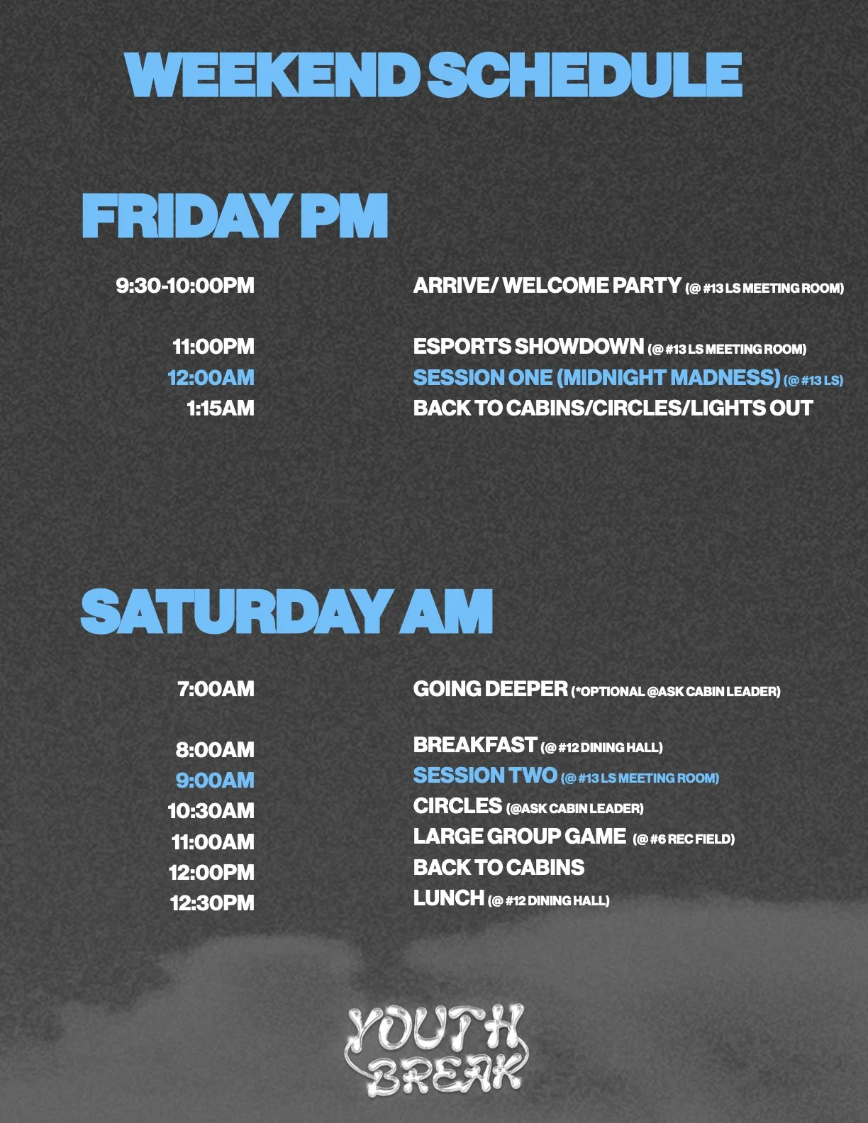 EVERYTHING YOU NEED TO KNOW TO GET READY FOR YOUTHBREAK 25 IS RIGHT HER EON THIS PAGE! YOU CAN TAP THE PICTURE BELOW TO MAKE THEM BIGGER OR USE YOUR FINGERS TO PINCH AND ZOOM IN!